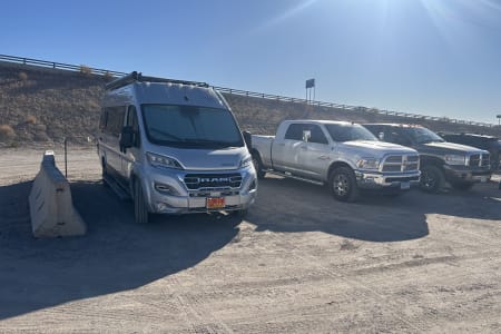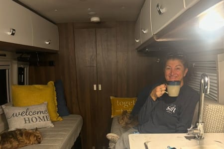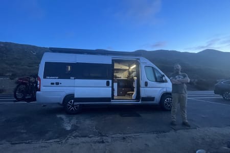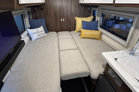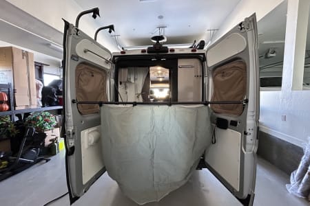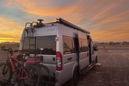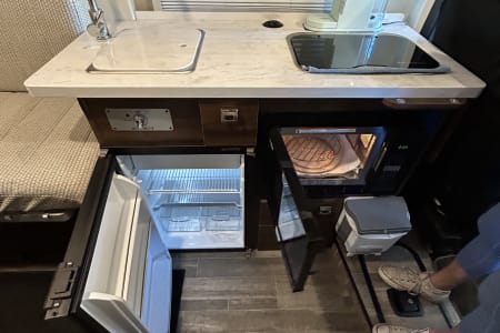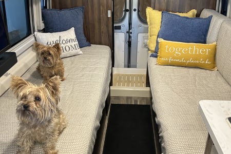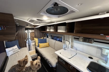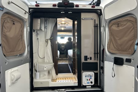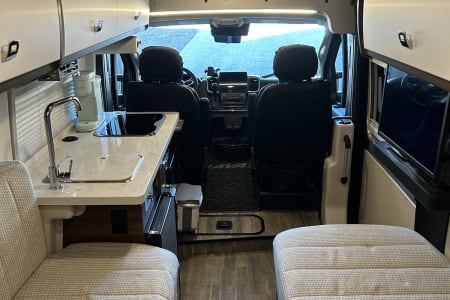 This brand-new, 2025, fully-equipped compact luxury 2 person camper van is your perfect companion for stylish camping and getaways! With modern Euro-style cabinetry and an array of top-of-the-line features, it offers both convenience and comfort. The spacious kitchenette is outfitted with everything you need to prepare meals on the go, including a refrigerator, 2 burner gas cooktop, a sink, and a multi-purpose oven/microwave. Relax in comfort on the plush sofas that easily convert to a King size bed or leave it as 2 twin beds, while enjoying your favorite Netflix shows on the 24" TV, or set up your laptop at the office-style workstation, complete with swiveling captain’s chairs to ensure maximum productivity. When the weather's great, take advantage of the 12' motorized awning with LED lighting, creating a perfect outdoor space. Unwind in the two camp chairs and enjoy a peaceful cup of coffee under the open sky. This easy-to-drive, maneuverable van is the ultimate combination of luxury and practicality, making it ideal for both road trips and off-the-grid adventures. Packed with everything you need, it ensures a sophisticated and comfortable camping experience, wherever the road takes you!