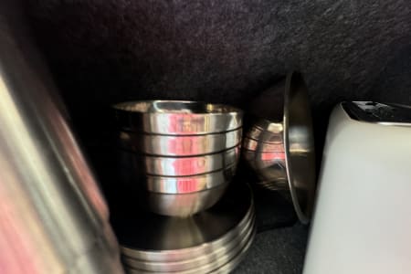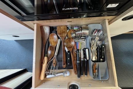 Cook your favorite meals in the kitchen. It has a fridge, induction stove and a convection microwave.