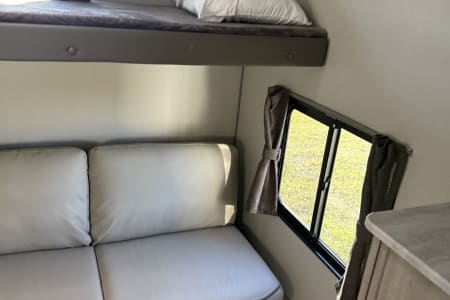 Ideal for families, it includes three bunk beds and a pull out couch in the back room and a queen-size bed in the front bedroom, accommodating everyone comfortably. The camper boasts a large bathroom with a walk-in shower and plenty of storage throughout.