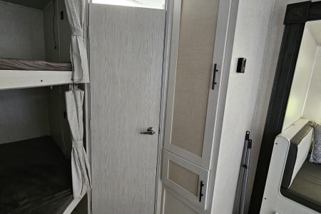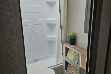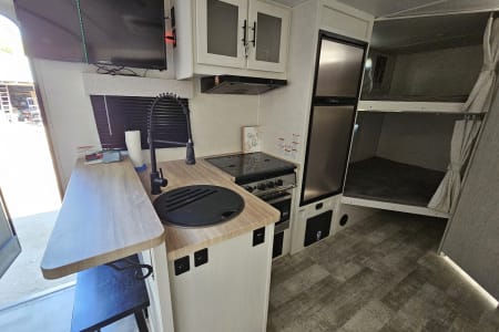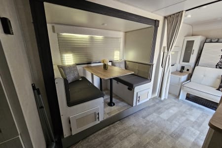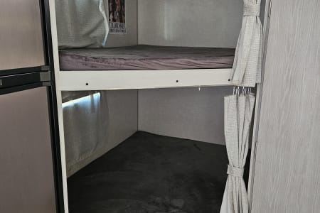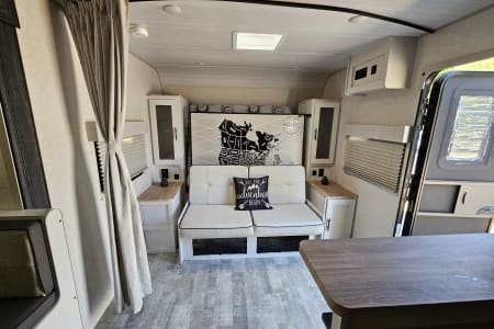 We have a brand new travel trailer that is lightly used. It is beautiful, spacious, and provides a comfortable place to spend time when enjoying the outdoors. It is built lighter than most other trailers which makes for an easy haul! I've decided to share this wonderful camper with others to make their own memories, and have more opportunity to adventure. This camper has a queen sized murphy bed, and double sized bunks. The kitchen table goes down to make an additional bed and could fit up to 8 people, if needed. There is ample storage for your belongings both inside and out of the trailer, and a microwave only (convection supplies not included). The kitchen has a small 2 seat bar which is great for extra seating/eating space. There is a TV (with satelitte channels or DVD player included. Bring your own DVDs). The A/C works great and the heater. Everything runs off of electric or propane. There are regular outlets and USB plug-ins but they only work when connected to 30 Amp outlet or generator. This is our first year renting and we are open to ideas to continously better your experience, please feel free to share your thoughts with us on what we can do for you and your guests!