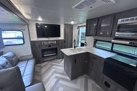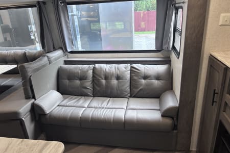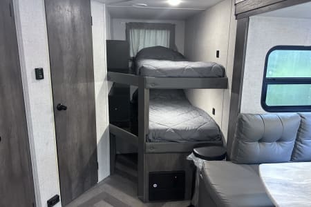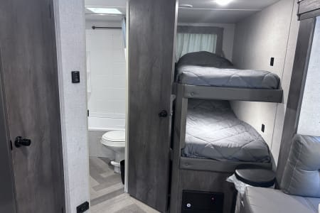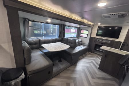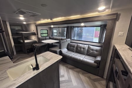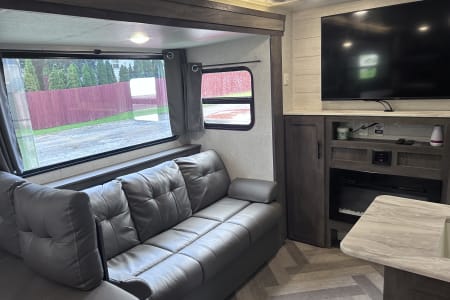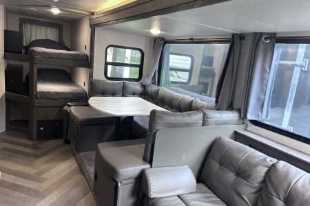 C&S travel trailer will meet all your needs and expectations of camping! Pet Friendly!! Outside mini fridge, linens, and tableware is provided for easier camping. This beautiful camper will sleep up to 6 people with a master Queen bed, Twin Bunk and both the dining set and couch fold down into a twin bed. We do NOT provide any cookware, such as pots and pans or cooking utensils. CAMPER IS ONLY DELIVERED to Emmett KOA Holiday. We DO NOT allow any towing of this Travel Trailer. Please reserve both site AND camper reservations.