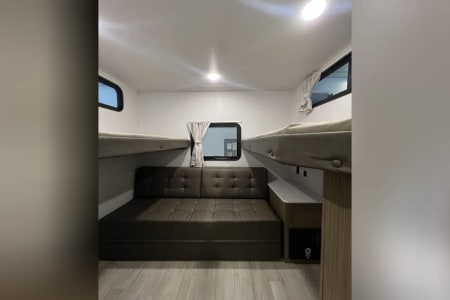 This is a full-sized family travel trailer with loads of upgrades and amenities. The private bedroom features a King island bed with nightstands. The living and dining area slides out to offer extra roominess and comfort with a full size kitchen which includes an oversized 11 CU. FT. refrigerator, stovetop, oven, and pantry. U-dinette, Versa-Lounge, and walk-in shower in full bathroom. The dinette and sofa bed both convert into beds for extra sleeping space. The rear of the trailer features 2 bunk beds and Couch that lays out flat to a Queen size bed.