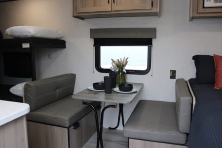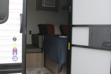 The kitchen is fully stocked with everything you need to whip up meals on the go, including silverware, cooking utensils, pots and pans, and even a Keurig coffee maker to start your mornings right. Enjoy the great outdoors with the power retractable awning or stay inside to relax with a 32-inch smart TV, complete with an antenna booster.