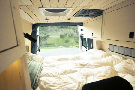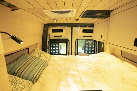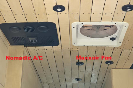 So... we added complete insulation to stay warm and deaden outside road noise. Then we added a state-of-the-art Ellwell Timberline forced air and radiant floor heating system that runs off the diesel in the fuel system. For hot days, we had to have Nomadic Air Conditioning and a MaxxAir fan. Both are located over the platform bed.