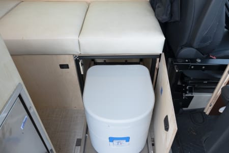 There is a custom-cut carpet in the van to allow you to easily clean it up if you make a mess. And last, and probably not least, there is a Joolca portable toilet that tucks nicely away until it is needed. We also provide a propane two-burner Jetboil Basecamp stove and all the free propane that you can use.