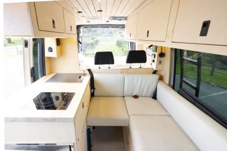There is a bench that extends from the platform bed to the driver's seat, and it easily converts to two more front-facing, belted seats or as a second bed that is approximately 5'4" and almost 40" wide.
