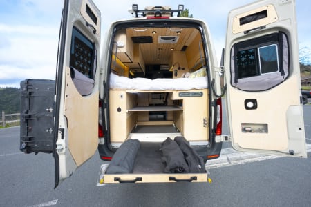 There is a waterproof Pelican storage box on the back to store tools and wet things outside of the van. There is also a slide-out tray to make it easier to access all the things that you will pile in the "garage." We also have 3-way lighting systems for the garage, both the rear doors, and the sliding door to make it easier to get oriented when you come into the van at night.