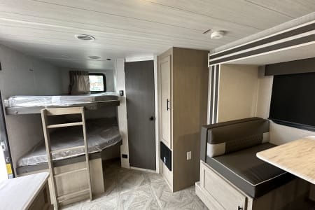 The forest river Evo is the perfect trailer for a family! It has twin bunks in the rear along with a king size bed up front. Everything is electric with just a push of a button you can have the awning out and camp is set up.