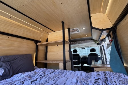 Comfy bed, full black out window shades for privacy, a gas heater to keep the van toasty throughout winter, and much more!