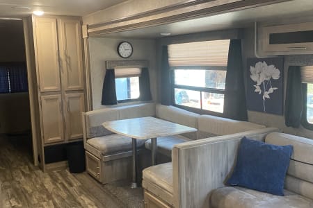 Great RV, sleeps 9, master bedroom with queen bed, separate room with 3 bunk beds, full kitchen, full bath, dining room, living room, 3 TVs, 2 slide outs, electric canopy, outside kitchen, outside shower, two entry doors, access to the bathroom without going through whole RV, and completely furnished. Fully Stocked--Includes linens, dishes, cookware, and Keurig Coffee Maker. RV Rental Delivery, Set Up, and Tanks emptied available. All you need is your food, clothes, and excitement for a Great time.