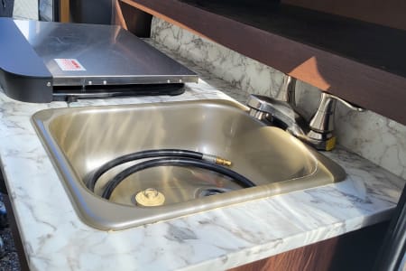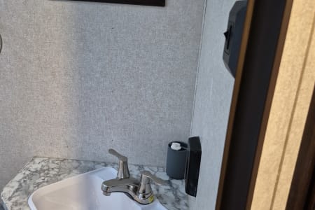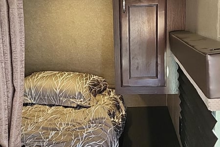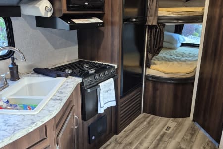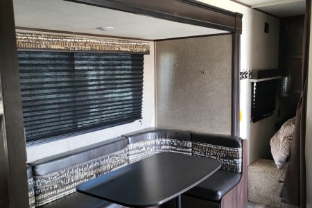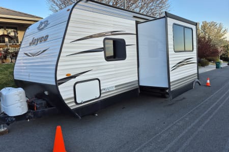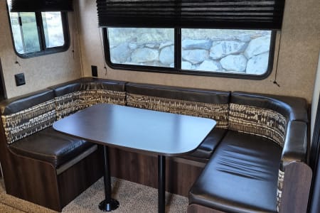 Enjoy your camping adventures in this comfortable and clean trailer. Features an outdoor kitchen with stove top, sink/faucet and refrigerator. Inside you'll find bunk beds, a queen bed and convertible large dinette. Cookware, dinnerware and utensils for your convenience and amenities as towels, toilet paper and cleaning supplies provided. Outside you can enjoy the provided chairs, matt and table and bbq. Whether you are glamping or camping, this trailer is your go to for your travel fun.
