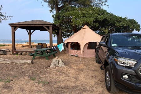 Our Assortment of pop-up tents that sleep 2 to 3 adults as well as a very large amazing bell tent that sleeps 10 people comfortably is your hole away from home in Paradise!