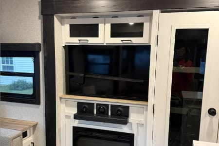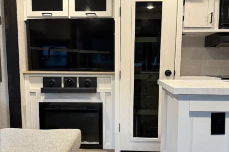 *Rear Living Area: Designed for relaxation with theater seating, breakfast nook, two reclining massage chairs, tri-fold sleeper sofa, smart TV, JBL Bluetooth stereo, cozy fireplace, and three oversized windows that bring the outdoors in.