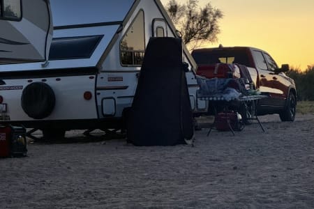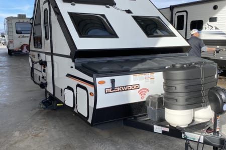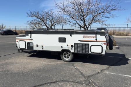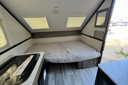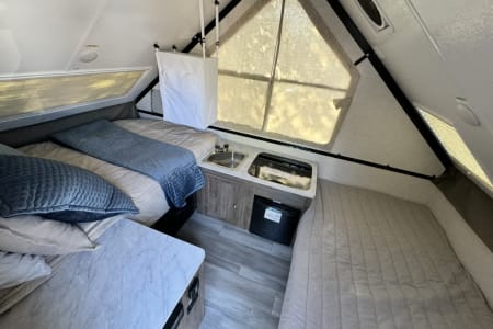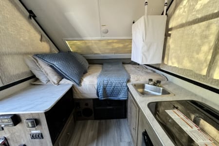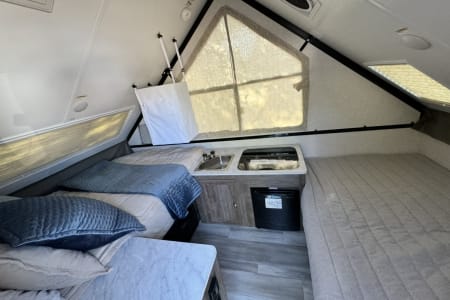 2023 foldable A-frame camper. Easy to tow with a dry weight of 2120 lbs! Sleeps 4, 3 if you’re body a builder and need more space xD. Loaded with everything. Solar power, mini fridge, stove, sink, microwave, ac, heater, Bluetooth speaker, outdoor shower, portable toilet and small tent to hide it in.