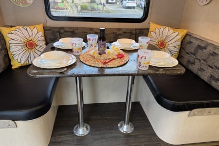 -Spacious dinette converts to a second bed—perfect for kids or extra guests