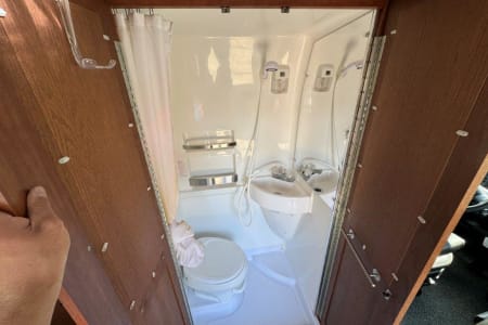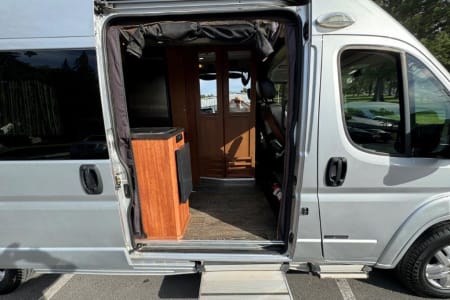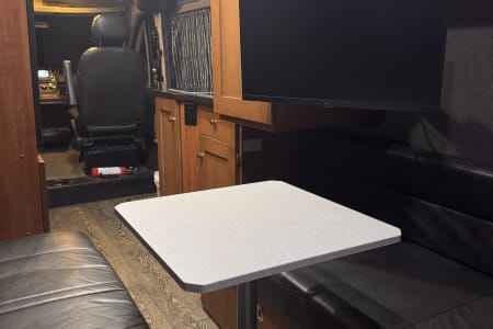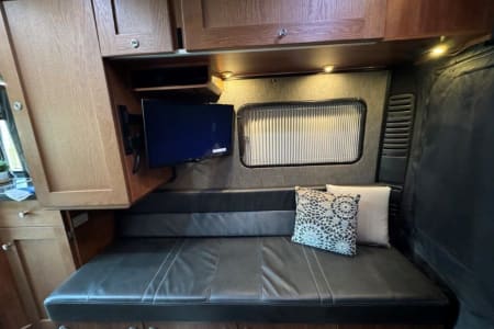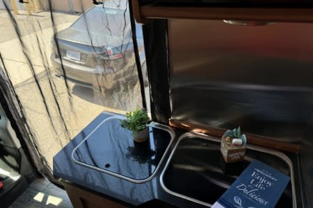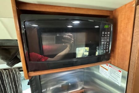 Includes sink, propane stove, fridge/freezer, microwave, and all the basics to cook meals on the road.