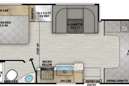 •Comfortable Sleeping Arrangements: Features a queen-sized bed, over-cab bunk, and convertible dinette for up to 6 people. (3 adults comfortably).