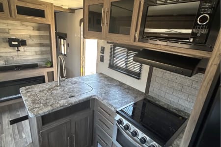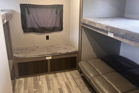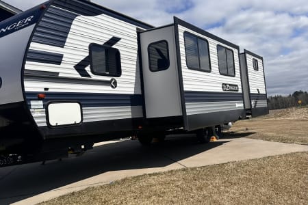 Enjoy a great family camping trip in our CrossRoads Zinger 328 SB. This is the perfect family camper with its master bedroom and large bunk room with 3 beds. The camper will sleep up to 10 people. This camper has an unloaded weight of 7756 lbs. and a GVWR (max weight) 9740lbs. My family and I love spending time camping, and would love you to share in that experience.