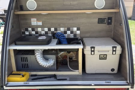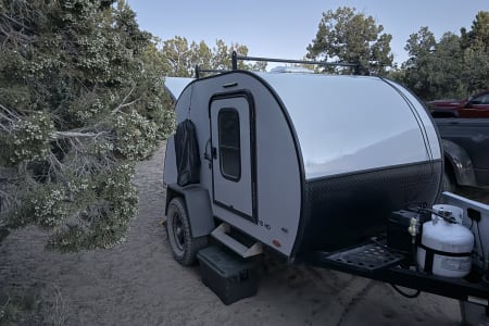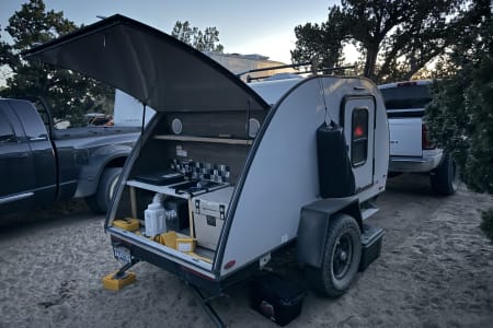 Get off the beaten path with this off-road camper. When loaded for adventure this teardrop weighs in at around 1500 pounds, making it ideal for smaller vehicles and off-road adventures. We include our propane fire pit for a quick and clean campfire as soon as you get to camp. The 2 included solar panels keep all devices charged and ready to go. A cozy kitchen on the back is a great place to hang out while grabbing snacks to fuel your adventure.