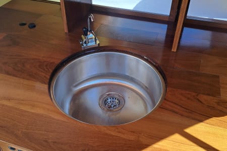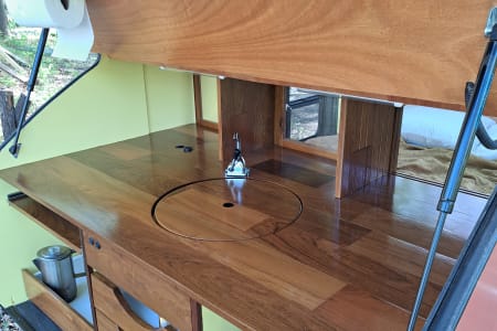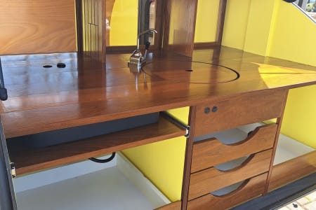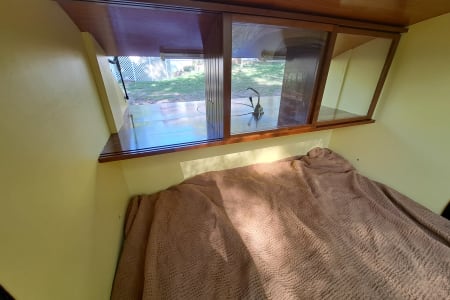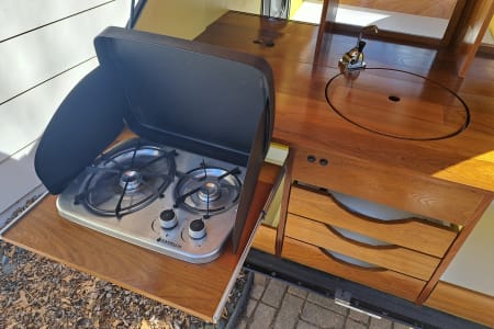 The cabin has operational screened windows (with blinds for privacy) and a remote-powered rooftop fan for cooling and ventilation. A sliding pass-through window between the cabin and galley allows interaction between guests and handing off of goods. The galley has a sink, faucet, and double-burner propane stove for all your cooking needs. Kitchen galley is stocked with all the essential cooking supplies, utensils, spices, and an available cooler- you just bring the food.
