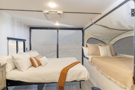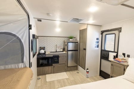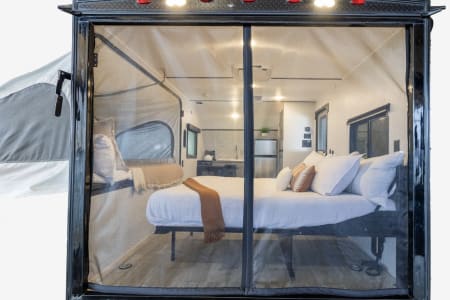 It’s an excellent choice for adventurers who want to explore the great outdoors without upgrading their vehicle or dealing with the challenges of towing a large camper. It can sleeps up to 4 people and offers the functionality of a full-size RV in a lightweight, compact design that’s easy to tow with an SUV.