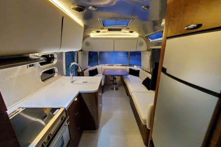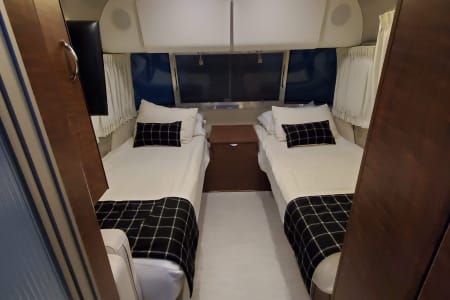Experience luxury glamping in our 2019 Airstream Globetrotter, delivered and fully set up at your chosen campsite! This front bedroom twin model offers a spacious, modern interior that feels like a New York City apartment on wheels. It comfortably sleeps four adults or two adults and four children, making it perfect for family trips or group getaways.