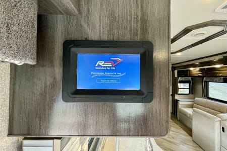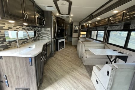 Outside, you’ll find multiple power awnings equipped with snow and debris shields for added durability and protection in all seasons. Enjoy entertainment inside and out with multiple LED TVs, including a built-in exterior screen for those perfect campfire movie nights.