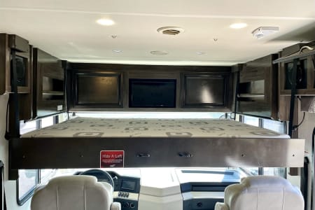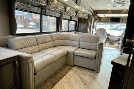 The master suite includes a luxurious king-sized bed, while the large sectional sofa converts into a sleeper, and there’s even a drop-down queen bed over the cab area—plenty of room for family or guests.