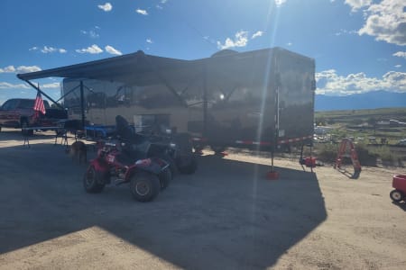 This is a 2023 it won't let me use that year but trails west has been making the freeride trailer for years now. 28 foot goose neck toy hauler camper. Ultimate toy hauler can handle 5 standard 4 wheelers , 4 long track snowmobiles , UTVs of all sizes or jeeps depending on height, more dirt bikes then a starting gate at a motocross race. This toy hauler is designed to be the ultimate hauler trailer with all the essentials of a camper. Has toilet shower combo. Sink and two burner stove. Microwave. TV with blue ray player. Inside and outside stereo speakers. Awning with led under lights. 2 roof top AC units to keep cool on hot summer days. 6 gallon water heater 40 gallons fresh water 40 gallon black and grey water tanks Full length screen door on rear. 2- 7.5 lb propane tanks. Refrigerator runs on propane or AC power. Legs for loading ramp to make into a deck.
