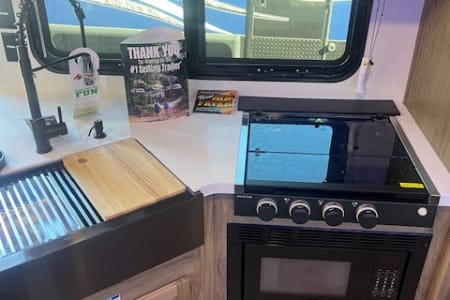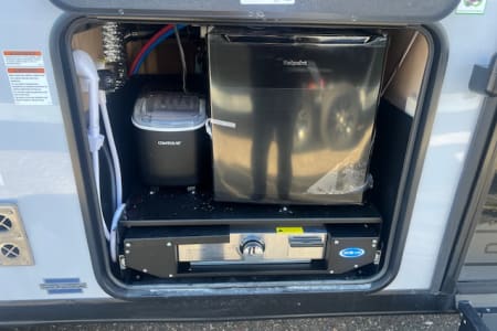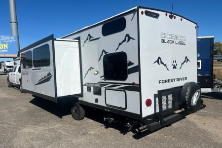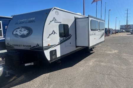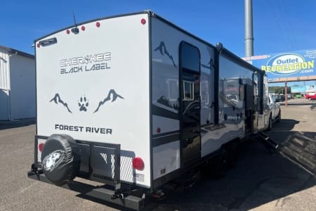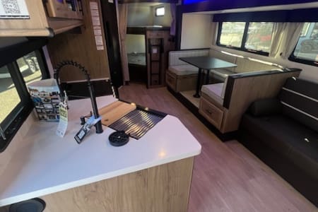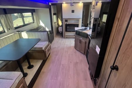 Features one slide out, dual entry doors, exterior kitchen with ice maker, A/C, awning, storage rack on back, front queen bed, entertainment center with stereo system and electric fireplace, U shaped dinette, jack knife sofa, rear double bunks, private bathroom with toilet and shower, large fridge, microwave, kitchen pantry, stove/oven, Juice Pack, tons of storage space and more!!