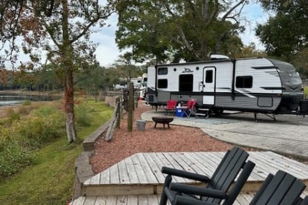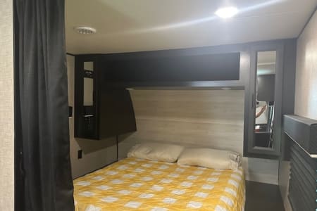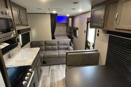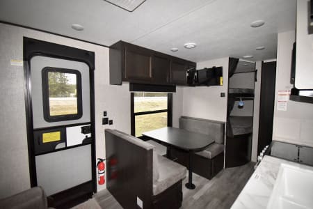 This spacious travel trailer comfortably sleeps up to 8 people, making it ideal for family trips, friend getaways, or even a cozy couple's retreat with room to spread out. Featuring a private queen bed, double-over-double bunks, and a convertible dinette and sofa, there's room for everyone to relax after a day of adventure.