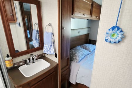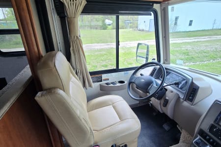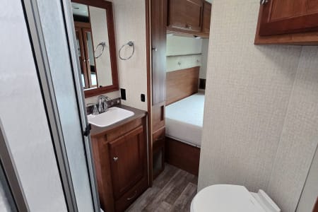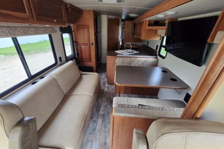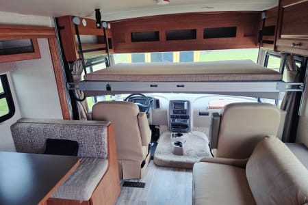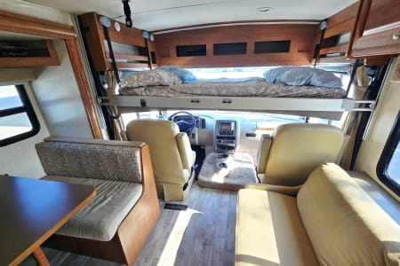 Large panoramic windows bring in natural light & provide scenic views. The living area contains dual-function furniture (a sofa that folds down into a bed & a dinette that converts into a sleeping space), a powered StudioLoft bed that drops down from the ceiling, & swiveling cab seats to expand your lounge area. Pull the front window wrap around curtain closed at night for privacy.
