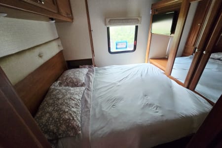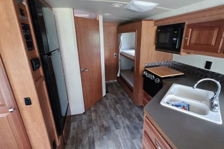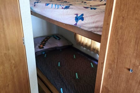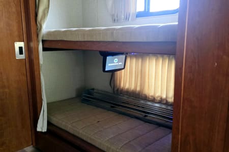 Rest comfortably in the private master bedroom with a walk-around queen bed. Kids will love having their own space in 2 bunk beds, each with a 10" monitor DVD player & privacy curtain.
