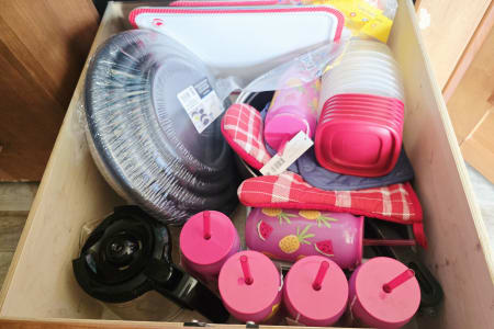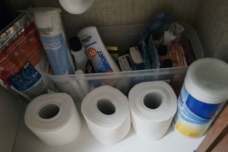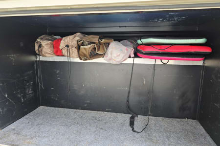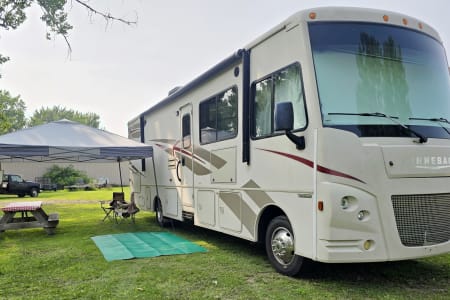 The a/c blows cold from both the cab & rooftop unit. The living area features a 39" TV and DVD player. The bunks feature 10" top-mounted DVD players. The bedroom contains a 24" TV. Water/Showers/Faucets run hot & cold, and can be used with it's own containment system or through campsite hookups. Because we do not allow the use of the awning-to avoid damage and mechanical issues- we include a 12x12 pop-up canopy.