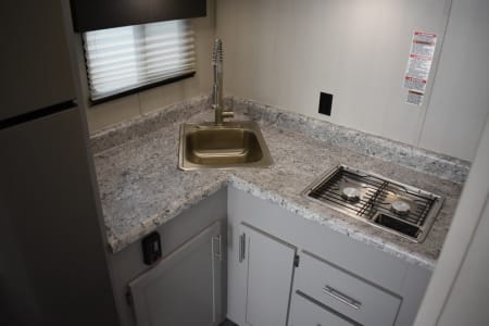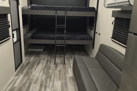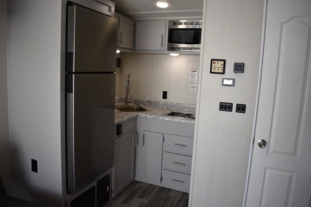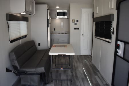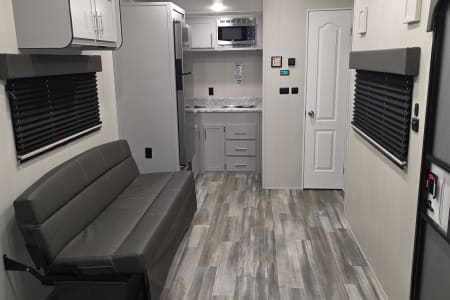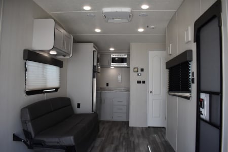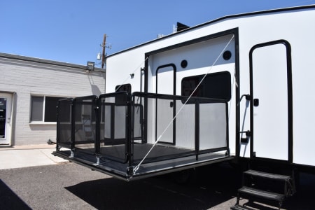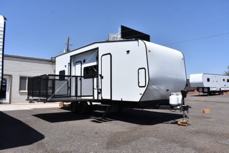 The only toyhauler that has a 184x78 inch garage that can accommodate a 4 seater 72 inch wide side by side that can be towed with a HALF TON TRUCK! Only 22 feet long with side patio to hang out on, two queen rear bunk beds that go up and out of the way for a complete open floor plan. Large refrigerator/freezer, kitchen sink, and a two burner cooktop stove. 100 gallons of fresh water, 24v 200ah lithium battery with 2100 watts of solar on the roof and a 3000 watt inverter to run all of your 110 appliances including the microwave! Nice outside flood lights on all 3 sides to illuminate the campground. Unit has a toilet with a 36x24 shower pan with a 6 gallon gas water heater. Dual 20lbs propane tanks with a 20k BTU furnace to keep you warm while your dry camping in the desert and a nice 15k BTU air conditioner to keep you cool in the summer.