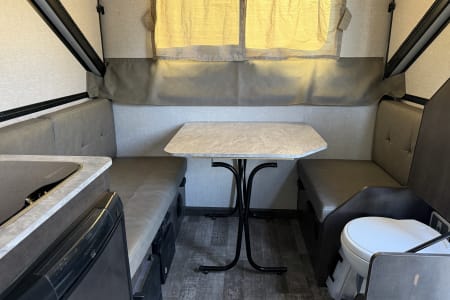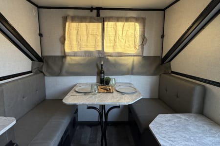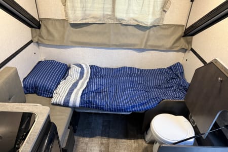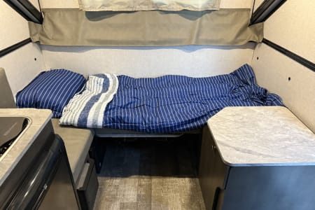 Comfortable Sleeping for 2–3 – Cozy bed and dinette conversion with soft bedding and blackout curtains.