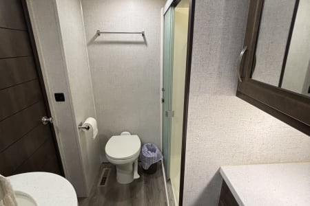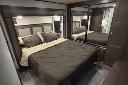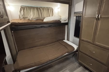 This the perfect camper for a big family or a group of friends. It has its own separate bunk room in the back with its own separate bathroom. With 5 slides this camper has all the room you need. It also has a separate door to the bathroom from outside for easy access. It comes fully furnished with everything needed to go camping. Bedding, towels, utensils, cooking utensils, bowls, plates and cups, a coffee pot also.  .