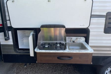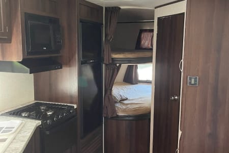Featuring a compact yet spacious design, the Jaybird offers comfortable sleeping arrangements with double bunks and Queen bed, a fully equipped kitchenette, and a bathroom with a shower. Whether you're heading to the mountains, the beach, or a local campsite, this camper is easy to tow and set up, making your trip hassle-free.