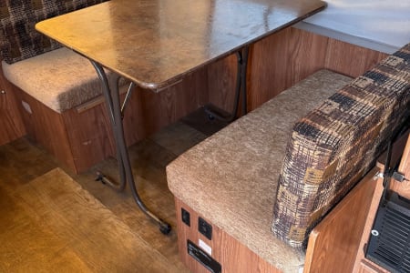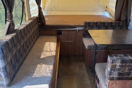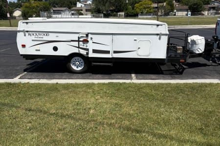 Family fun awaits with this clean light weight tent trailer with RV Queen and RV King beds that will sleep 2 adults each along with fold out dinette and couch beds that will sleep 1-2 kids each depending on age and size. Trailer has an indoor shower and cassette toilet as well as a cooktop and sink and an out door grill. Upfront there is open storage rack for bulky items. Set up is a breeze with an electric cable system to raise and lower the roof. Leveling jacks are provided with pads to land the feet on, pots, pans and plastic forks, knives and spoons along with paper plates and cups will be provided. Propane tanks will be full and ready and batteries will be fully charged. for an extra rental fee we will provide a yamaha 2000 watt generator to recharge the bateries if needed and it can also run the lights and water pump if desired. Overall this is an easy unit to set up and take down and pulls very nicely with smaller SUVs as long as your SUV can haul 3000lbs with a tongue weight of under 400lbs. We will provide sheets for the bed matresses but the fold out beds will require sleeping bags.