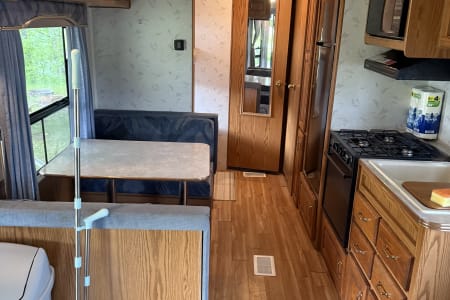 The camper features a bathroom with a sink, toilet, and shower, making it easy to freshen up after a day of adventure. While the camper does have a few small imperfections in the wood flooring due to its age, it’s in very good condition overall and has been well cared for. It also features a new refrigerator and AC unit!