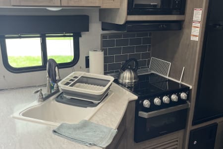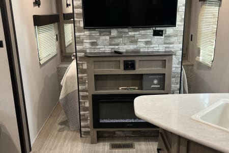 Roku TV can be connected to your phone hotspot for a latenight movie or show wind down. Automatic awning has LED lights. Electric leveling jacks make setup easy. We have modified the A/C to blow cooler and with less noise.