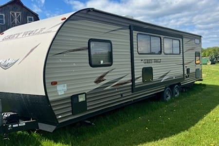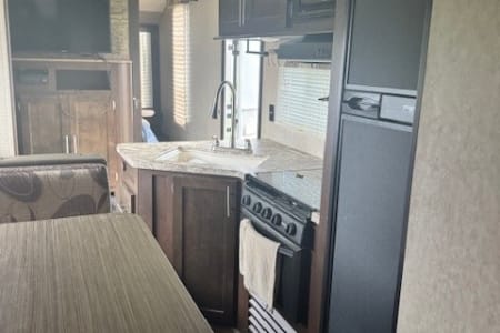 Great family camper with all amenities! Plenty of room for everyone to spread out in the camper, enjoy a large dining and entertainment area. Camper has an outdoor entertainment package radio will play through the outdoor speakers and TV can be mounted on outside of camper for outdoor movie night.
