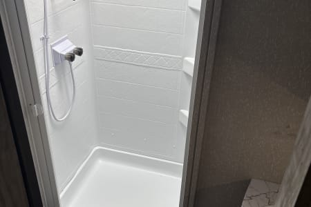 Bath: toilet, full shower, vanity basin and mirror cabinet storage