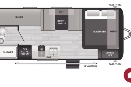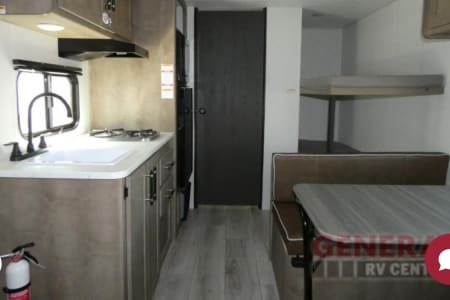 This trailer sleeps up to 5 adults comfortably with cozy bunk beds, a convertible dinette, and a comfy bed. It’s fully equipped with: