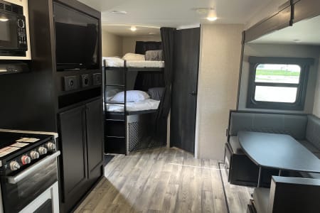 The 2024 Highland Ridge Range Lite 241BH is the perfect balance of comfort, convenience, and adventure-ready design. Built with families and groups in mind, this lightweight travel trailer sleeps up to 8 people comfortably thanks to its private queen bed, spacious double-over-double bunks, and a convertible dinette. Whether it’s a weekend getaway or an extended trip, everyone will have the space they need to relax and recharge.