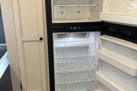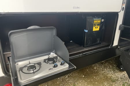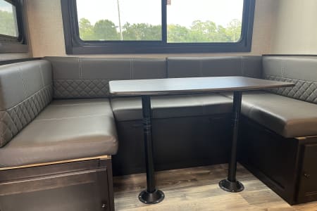 Inside, you’ll find modern amenities that make camping feel like home. The fully equipped kitchen includes a refrigerator, microwave, cooktop, and ample counter space—perfect for preparing meals on the road. The cozy living area offers a dinette for family meals or game nights, while the climate-controlled interior keeps you comfortable in any season.