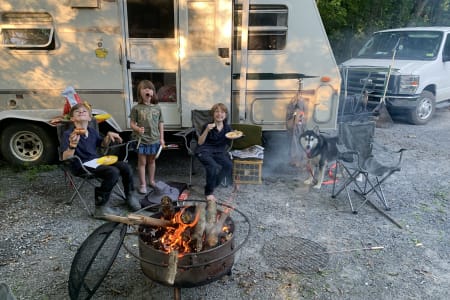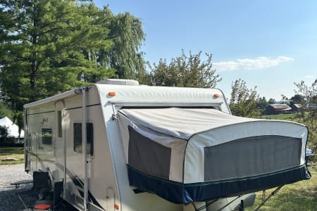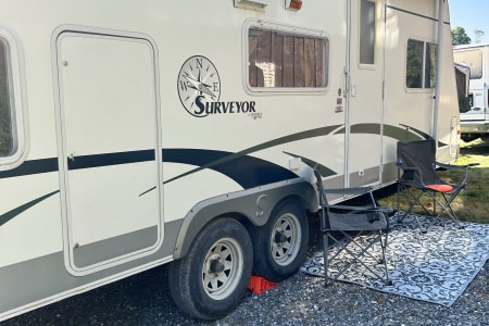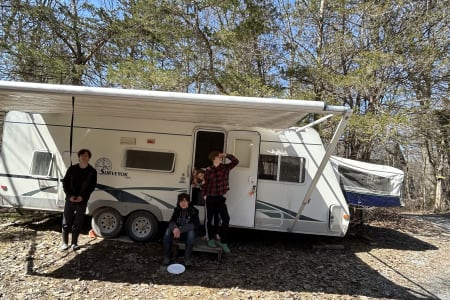 Our well-loved 2003 Surveyor SVT261T hybrid travel trailer isn’t perfect, but it’s clean, cozy, and packed with heart. This lightweight rig sleeps plenty: a fold-out queen bed in the front canvas section, full sofa bed, four rear bunk beds with a privacy door, and a folding table you can use for meals, games, or work—indoors or out. No hot water (our heater’s out), so it’s cold showers—or none at all—just like most Vermont state parks, where hookups are rare and rustic charm is the norm.