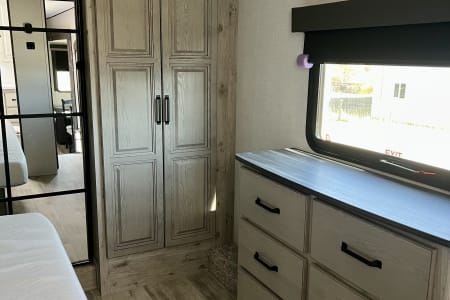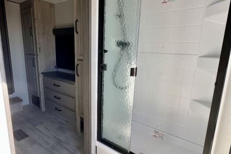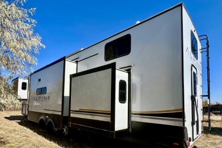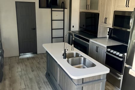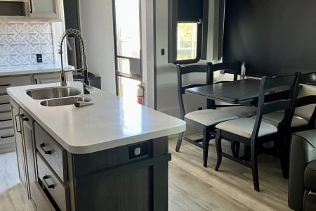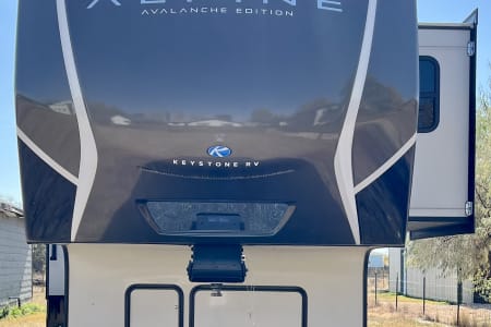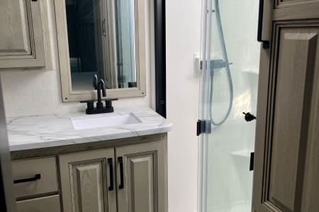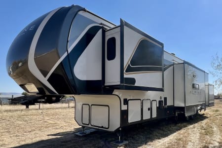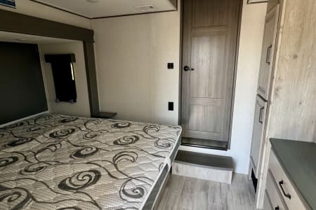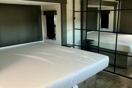 This home on wheels has 1 king bed and full private bathroom. 1 queen bed with a full private bathroom. Space for children for sleeping in open loft. Heated, massing love seat with USB ports. Large smart tv, full size refrigerator with freezer and ice-maker. Electric self leveling package, no cranks. 4 full slide outs and SO MUCH more!