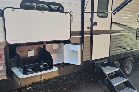 * Outdoor kitchen with mini fridge and 2 burner cook top – tailgate ready!