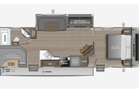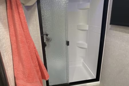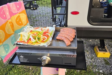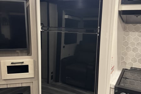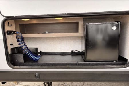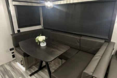 Bring the whole family along in our beautiful camper! The outdoor kitchen has a griddle top and small refrigerator to keep your drinks cold while you're by the fire. There is a 21' power awning with LED lights and outdoor speakers!